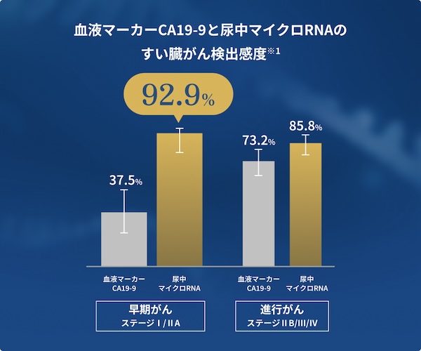既存の血液腫瘍マーカー測定に比較して、特に早期がんの検出において高い感度(病気のある人を正しく、「病気がある(陽性)」と判定できる割合)、特異度(病気のない人を正しく、「病気がない(陰性)と判定できる割合」)を示すとされています。
